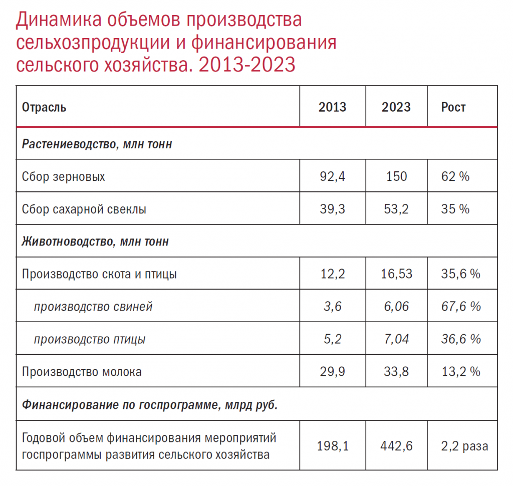 В растениеводстве сбор зерновых за этот период увеличился с 92,4 до порядка 150 млн тонн, сахарной свеклы – с 39,3 до 53,2 млн тонн. Высокие результаты достигнуты в животноводстве: производство скота и птицы по сравнению с уровнем 2013 года увеличилось на 35,6 % – с 12,2 до 16,53 млн тонн. В том числе свиней – на 67,6 % с 3,6 до 6,06 млн тонн, птицы – на 36,6 % с 5,2 до 7,04 млн тонн. Производство молока выросло на 13,2 % с 29,9 до 33,8 млн тонн. При этом годовой объем финансирования мероприятий госпрограммы развития сельского хозяйства вырос в 2,2 раза, с 198,1 млрд руб. в 2013 году до 442,6 млрд руб. в 2023 году. Все это потребовало планомерно повышать эффективность механизма агрострахования.
